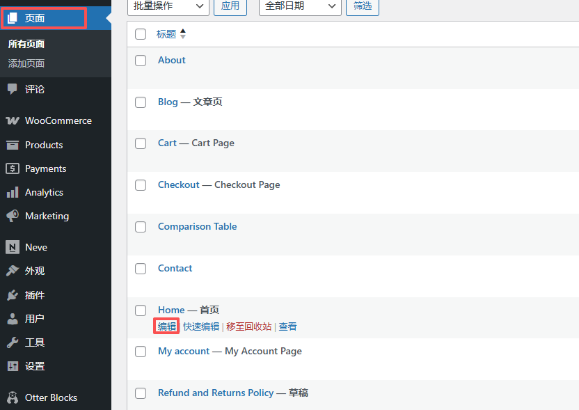 一、登录管理后台的账户和密码,进入后台管理界面,然后在左侧目录中找到页面,然后在页面列表中找到需要添加轮播图的界面,然后点击编辑,进入页面的编辑页面。