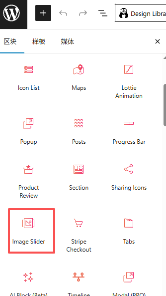 二、然后将光标放在需要添加轮播图的位置,点击左上角的+号,在显示出的列表里,找到image slider