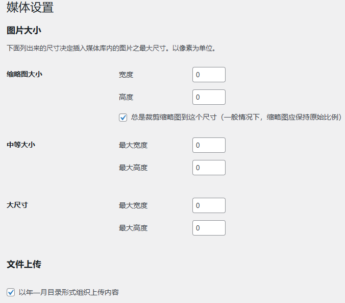 WordPress默认传一张图,会给你生成好几种尺寸的图片,浪费空间。所以这里建议把中等大小和大尺寸的设置为0,这样WordPress就不会自动给你生成大中尺寸的图片了。如果空间足够大,不介意的话,也可以不进行设置。